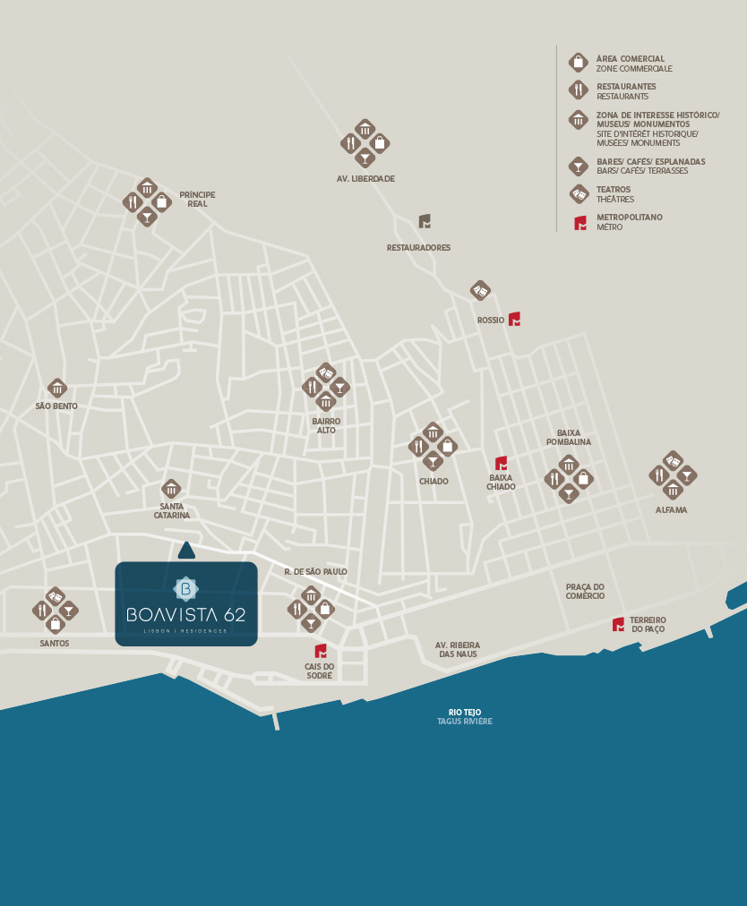 Dans le sillage de la Rua de São Paulo et de son typique funiculaire de Bica, l'immeuble Boavista 62 est à deux pas du belvédére de Santa Catarina, le point de départ pour partir à la découverte du Chiado et de Bairro Alto. L’immeuble se trouve tout près de Santos et de Cais Sodré, des quartiers parsemés des galeries d'art et des restaurants les plus branchés, avec des dizaines de bars et clubs qui animent la nuit, des terrasses accueillantes qui vous invitent à profiter du fleuve, outre les 220 jours de soleil qui illuminent Lisbonne tous les ans.